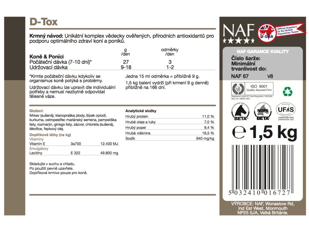 Unikátní komplex antioxidantů pro nutriční podporu optimálního zdraví. Přebytečné volné radikály se nahromadí v těle pokaždé, když kůň zažije nějaké trauma, ať již je to nakopnutí, kožní reakce, špatná kvalita kopyt, dýchací potíže nebo jakýkoliv ohrožení zdraví. Toto zahlcení toxiny má negativní dopad, a pokud se efektivně neodplaví z té dané oblasti, může se situace výrazně zhoršit. D-Tox obsahuje unikátní komplex vědecky ověřených přírodních antioxidantů, které bezpečně odplaví nahromaděné toxiny a obnoví rovnováhu. Vzhledem k velké zátěží a častému cestování, které mohou způsobit nahromadění toxinů v těle, může mít krmení D-Tox v udržovacích dávkách přínos pro koně v zátěži.
