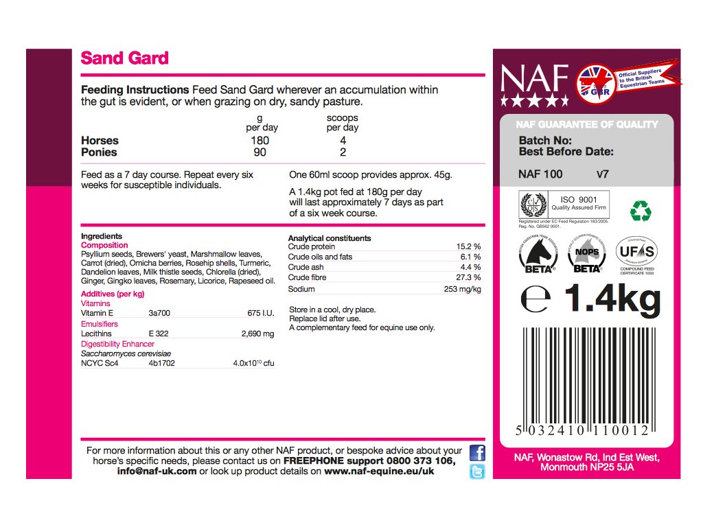 Sand Gard je podpora pro koně a poníky náchylné na střevní potíže způsobené pastvou na suchých, písčitých pastvinách. Když se koně pasou na velmi suché, prašné a písčité půdě, někteří z nich mohou její částečky pozřít. Sand Gard dodává živé probiotické kultury pro podpoření zdravé mikroflóry ve střevech, což pomáhá požitým částečkám projít trávicím ústrojím. Sand Gard lze krmit pravidelně pro dlouhodobou péči o trávicí trakt u koní s náchylností na takovéto obtíže.